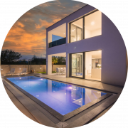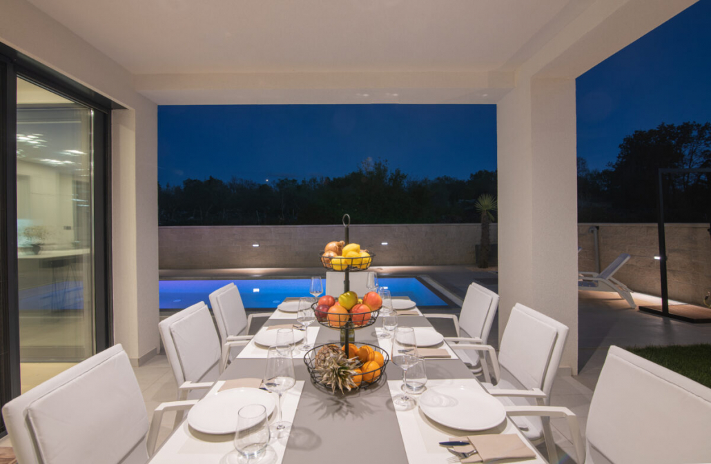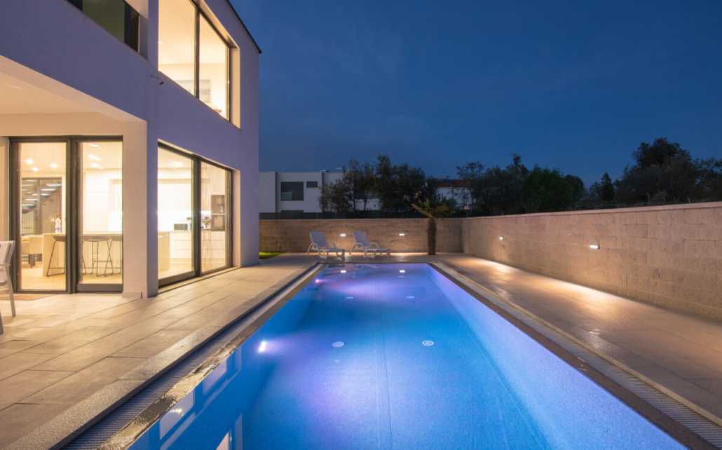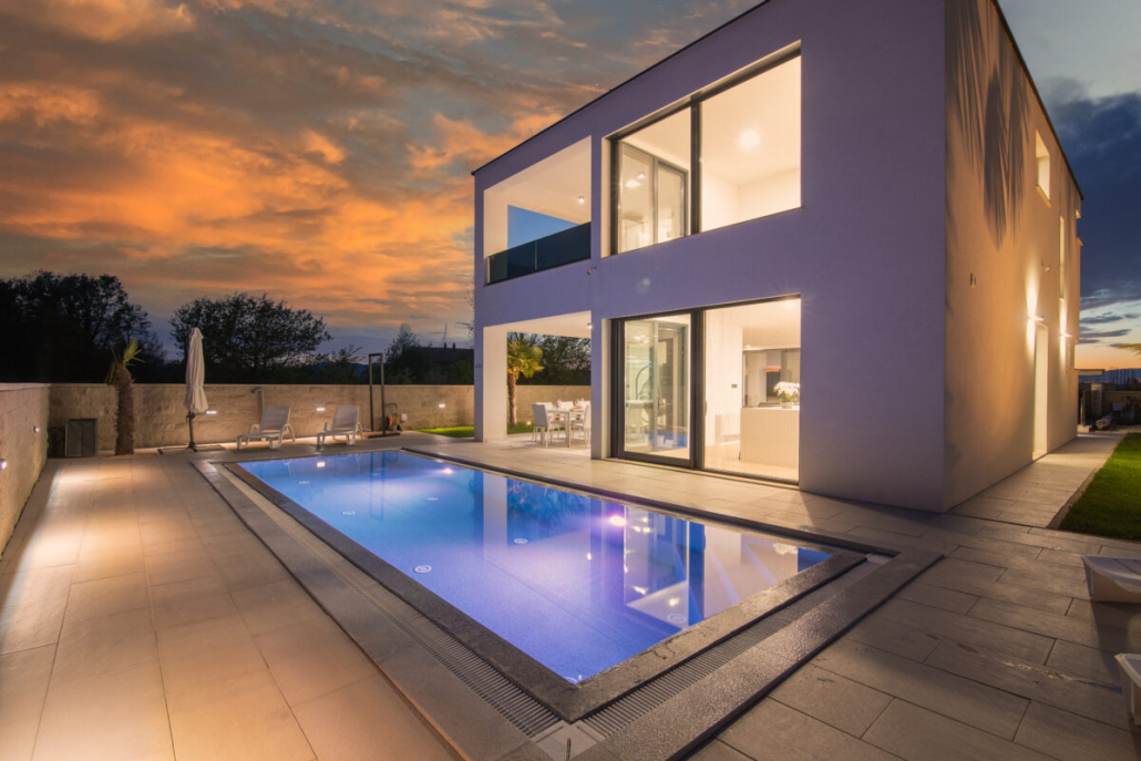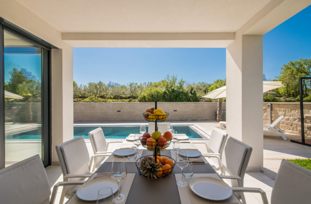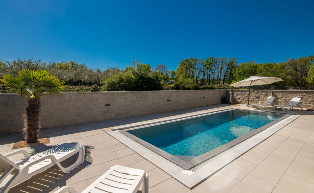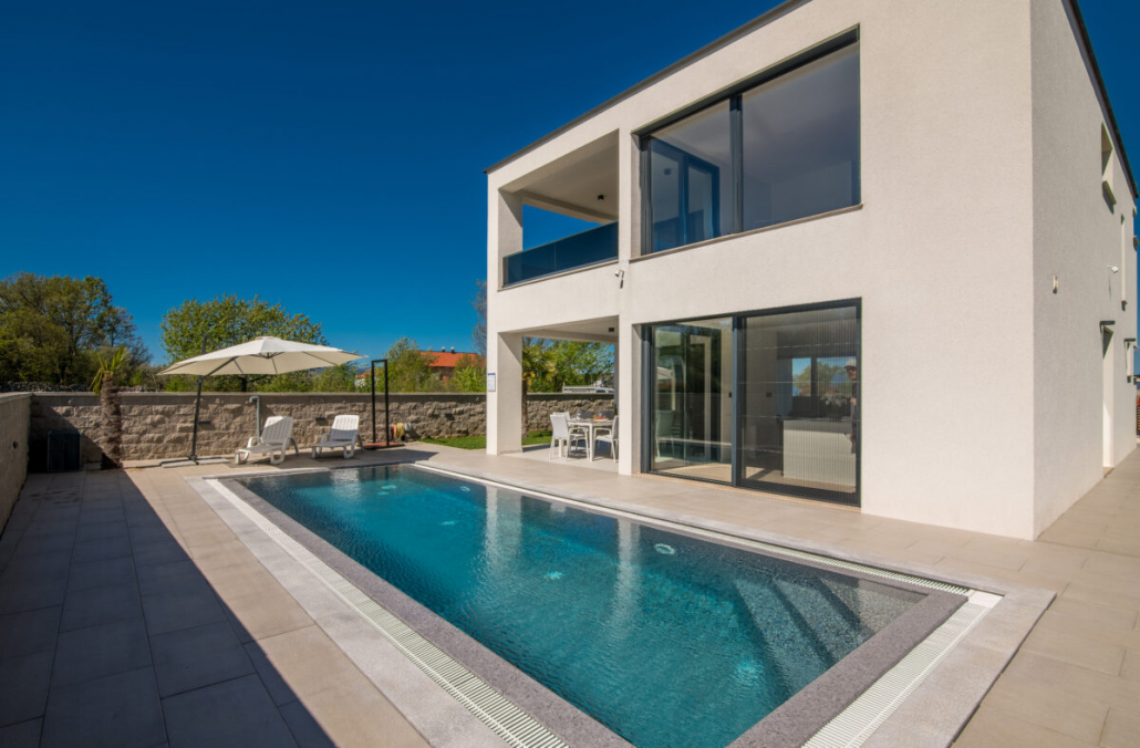 Der Außenbereich der Villa Weiss vereint natürliche Materialien, sanfte Farben und liebevoll gepflegte Pflanzen zu einem Ort, der sofort Urlaubsgefühl weckt. Der Pool bildet dabei das elegante Zentrum — ein klarer, moderner Blickfang, der an heißen Tagen für erfrischende Leichtigkeit sorgt.